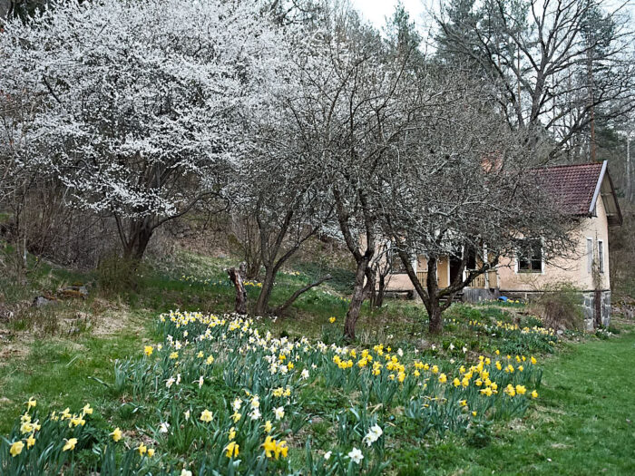 Påsk och pingstliljor klarar sig fint, och fortplantar sig, i naturliga miljöer. Välj äldre sorter, med moderna vet man aldrig. Bild från 26 april 2008 av den tomt utanför Västervik som Narcissus-experterna Klaas och Bodil van der Geest då odlade på. Mer på: Tre trädgårdar – efter pensionen.