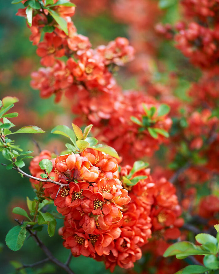 Rosenkvitten, Chaenomeles, är ett ovanligt buskträd som blommar uppenbart vackert den här årstiden. Får gula äppelliknande frukter framåt hösten som passar till aromatisk, jättegod, marmelad. Blir här i Uppland bara decimetrar hög. Bild tagen den 22 maj 2011 i Märsta.