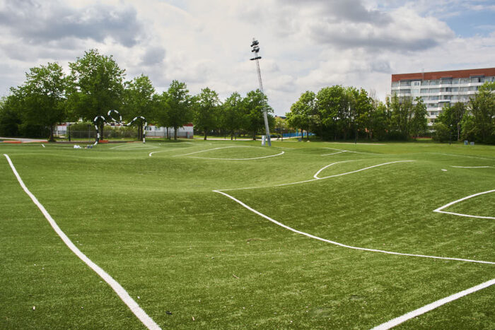 Puckelfotbollsplanen i Kroksbäcksparken (Malmö) kom till när konstnären Johan Ferner Ström ville spegla tillvarons verkliga villkor med orättvisor och slump. En fullt användbar och tokrolig skulptur även för vuxna. Bild från 28 maj 2013.