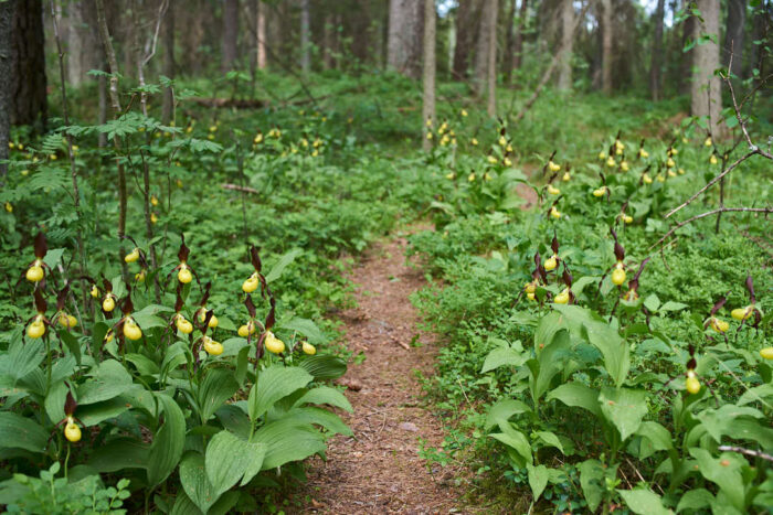Sagoblomman Guckusko, Cypripedium calceolus, i det lilla naturreservatet Falshålet i Uppland den 11 juni, 2021. Etablerar sig extremt långsamt men bildar grupper tack vare sin jordstam. Att den här växer i vanlig granskog beror på en lokalt kalkhaltig berggrund.