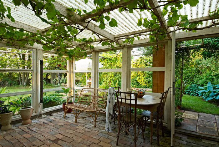 Inspiration från 13 juni 2006. Avslappnat och charmigt uterum med enkla möbler, frodiga växter och golv av återanvänt tegel hemma hos Kenneth Hallberg och Claes Johansson i norra Skåne. Vindruvsranka klänger i taket. En hel artikel om deras trädgård: I den tuffa delen av Skåne.