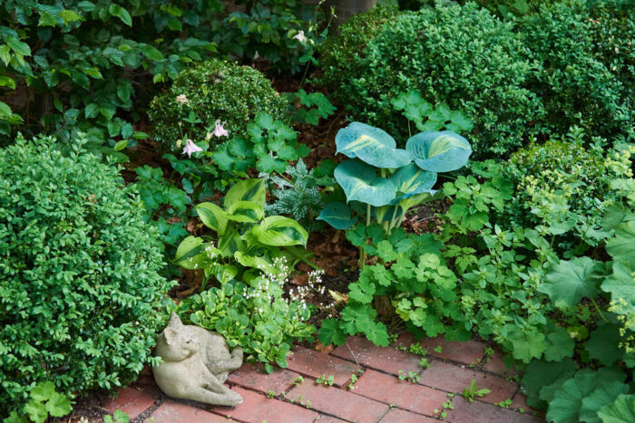 Helt enkelt en bild från hörnet av vår ena uteplats med funkior, buxbomsklot och jättedaggkåpa från den 23 juni 2020. Lite extra välputsat eftersom det var pandemisommar i isolation.