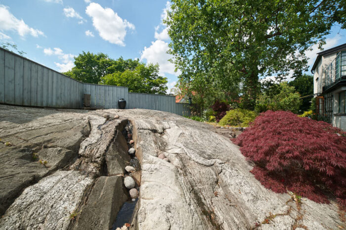 När Anna-Lena Wibom på Lidingö insåg att tomtens jordlager var tunt blottlade hon berghällen under. Ett naturens eget konstverk uppenbarade sig med knottriga och släta ytor, räfflor, sprickor och fascinerande skiftningar. Bild: 30 juni 2010. Mer i Stenhäll och pioner.