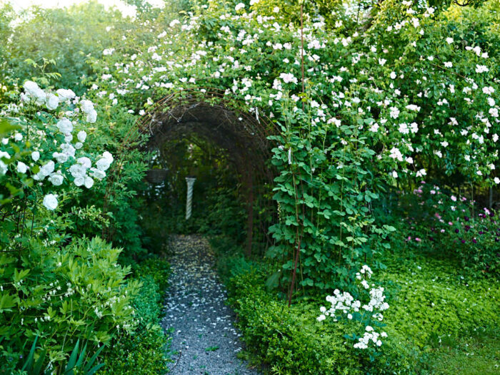 Tätvuxen Rosa ’Scintillation’ täcker en pergola av armeringsjärn hos Gunilla och Tore Bremer på Kyrkbacken i Västerås den 4 juli 2010. Mer om deras stadsnära, gröna trädgård på Pergolor i parker och trädgårdar.