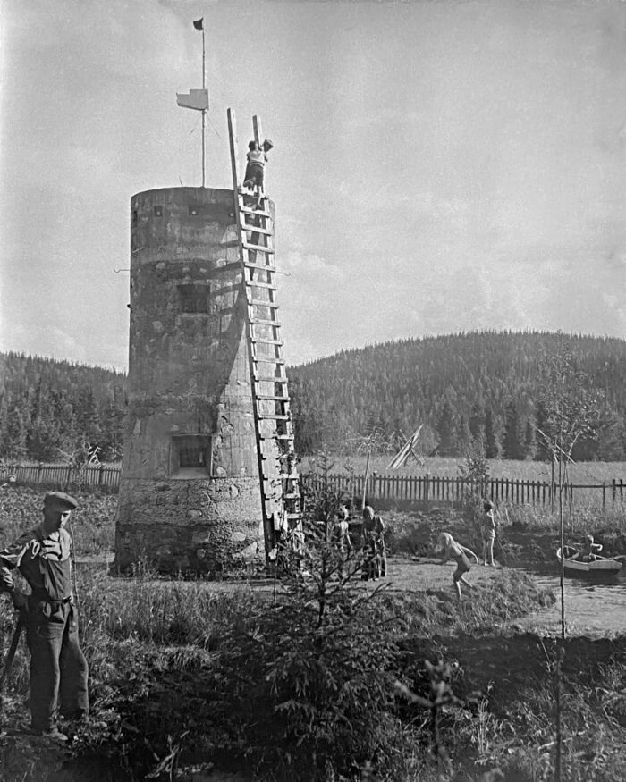 Det handlade mycket om basala saker som om att lära den utarmade befolkningen att ta vara på bär och äta grönsaker och att förbättra livet för barnen och ge dem en chans att ha lite kul. Bild från dammen som omger tornet, möjligen från de sista åren av 1930-talet.