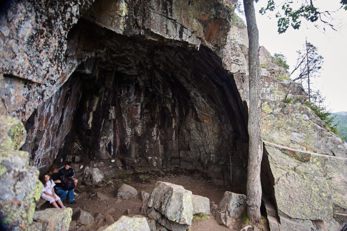 I grottan uppefter Skulebergets 200 m höga bergsvägg hade 1600-talsrövarna, enligt skrönan, sitt högkvarter. Förbifarande tvingades erlägga tull eller brandskattas på ägodelar. Undergången kom efter att de gett sig på ortsborna. Bild 6 augusti 2008. Mer i SKULESKOGEN OCH SLÅTTDALSSKREVAN.