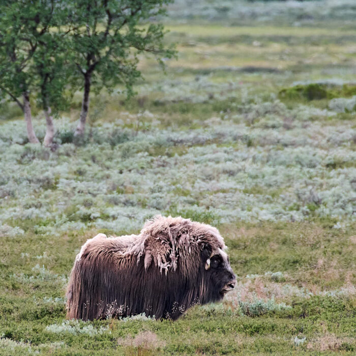 Tre gånger har tundralevande Myskoxar (Ovibos moschatus) planterats in i Norge, På tredje försöket, efter kriget, etablerade de sig i Dovrefjell, där de stortrivs. En handfull av dem smet över gränsen och etablerade sig i Härjedalen. Bild på en äldre hona, den 7 augusti 2025.