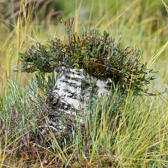 Den skönaste av björkstubbar vid en bäck mitt i Medelpads skogar. Den är bland annat bevuxen med Rosling (Andromeda polifolia), en nordligt cirkumpolär, städsegrön minibuske som hör hemma på myrmarker. Bild från 12 augusti 2005.