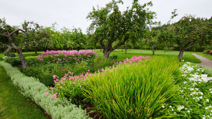 Runt 1910 drog Selma Lagerlöf igång arbetet med Mårbackas trädgård. Delvis drevs den som handelsträdgård, där sånt som äpplen och päron odlades för försäljning. Idag arbetar man med att återskapa den. Bild från Mårbacka i Värmland den 15 augusti 2024.