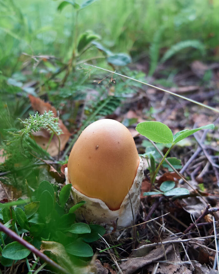 Ett ägg som växer ur marken? Trots att jag plockat svamp sedan koltåldern fattade jag inte att det här var en orange kamskivling (Amanita crocea) på väg upp. Anses ätlig men bör undvikas eftersom det är just en Amanita. Bild 17 augusti 2023 Sigtunatrakten.