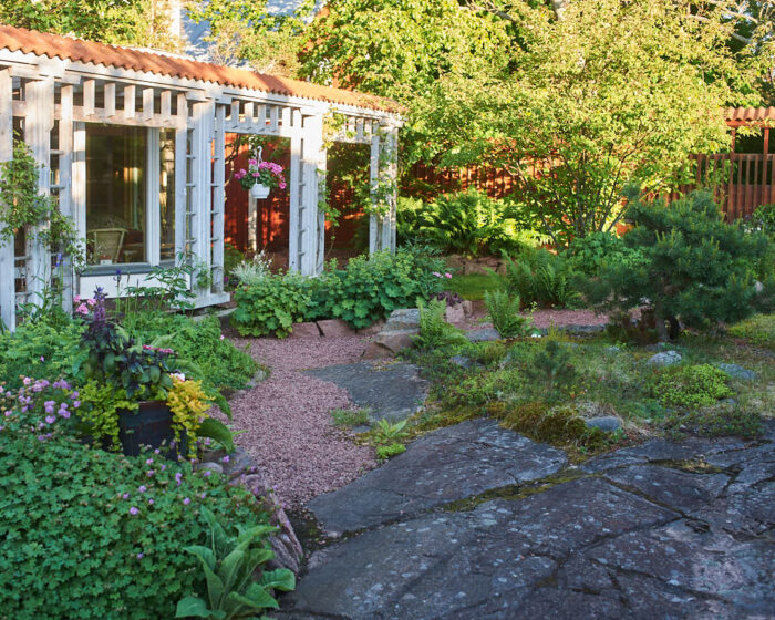 Idag är vi hemma hos arkitekterna Folke och Gunda Wickström på Åland. Lägg märke till hur de bevarat berg i dagen och fyllt på emellan med grus av röd åländskt rapakivigranit. Bild från den 19 augusti 2012. Mer på Åländsk arkitektträdgård,