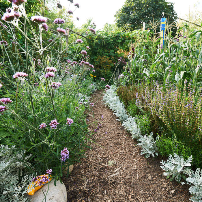 Mer Börje Remstam, den suveräne ekologiska odlaren utanför Enköping. En bit av trädgården från 6 september 2010. Till vänster jätteverbena, Verbena bonariensis. Längs gången silverek, Senecio cineraria, framför ståtlig majs. Om hans odlande: Frodigt utan spade.